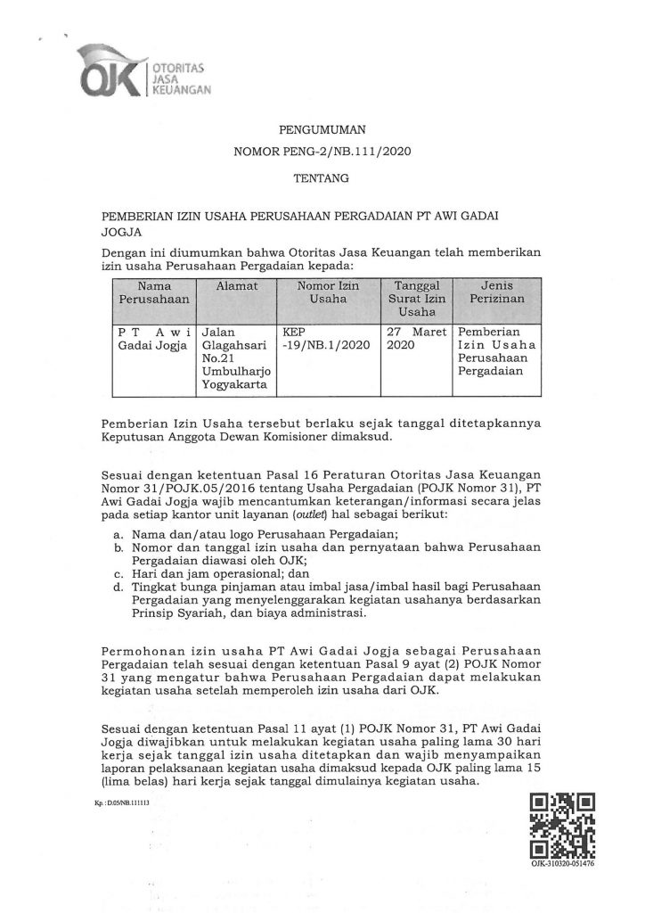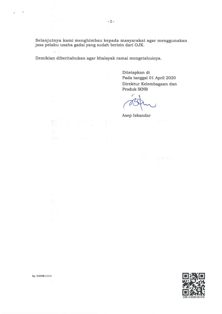 OJK Beri Izin Usaha Perusahaan Pergadaian PT Gadai Lancar Jaya